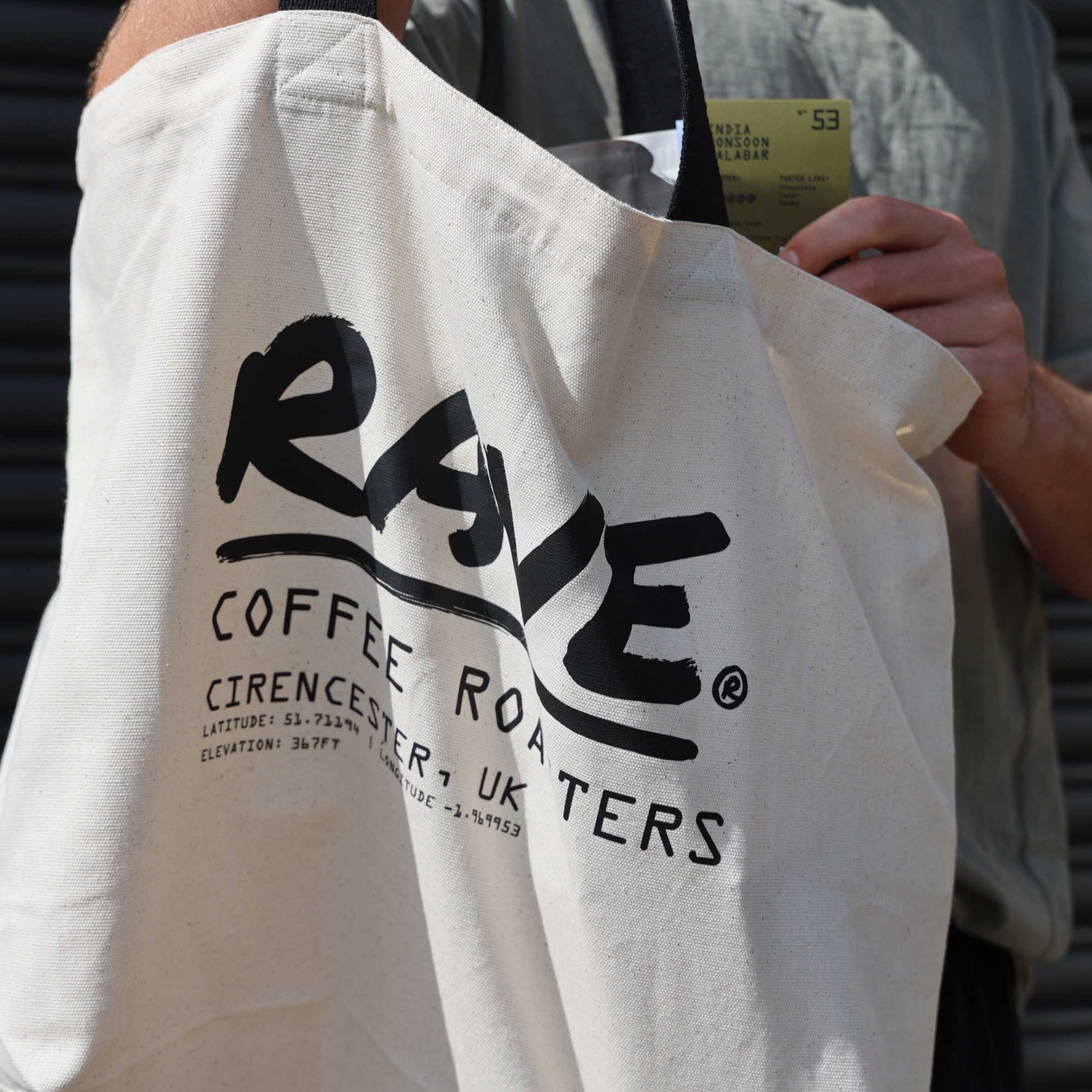Our Tote bag has been designed to hold all your Rave essentials, from our kilo bags of freshly roasted coffee, t-shirts, croissants and more. Screen printed with our Rave Coffee HQ co-ordinates and available in both black and natural colourways.