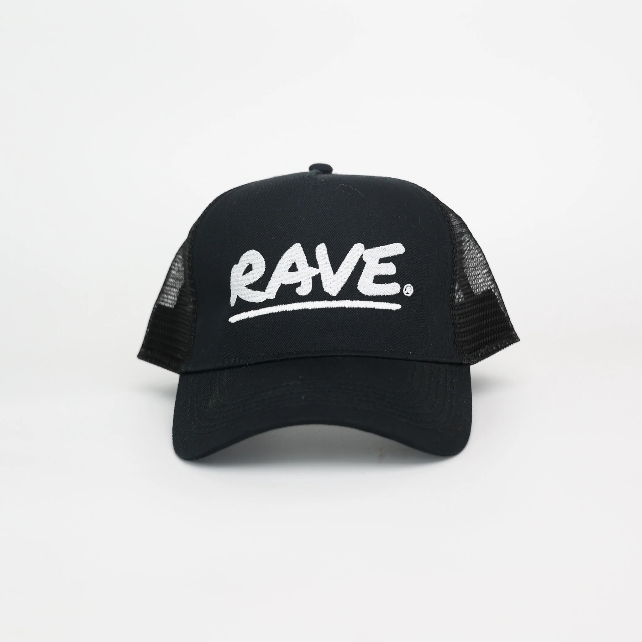 Trucker caps with a retro style snapback size adjuster. One size. (Black cap, embroidered with white Rave Coffee logo).